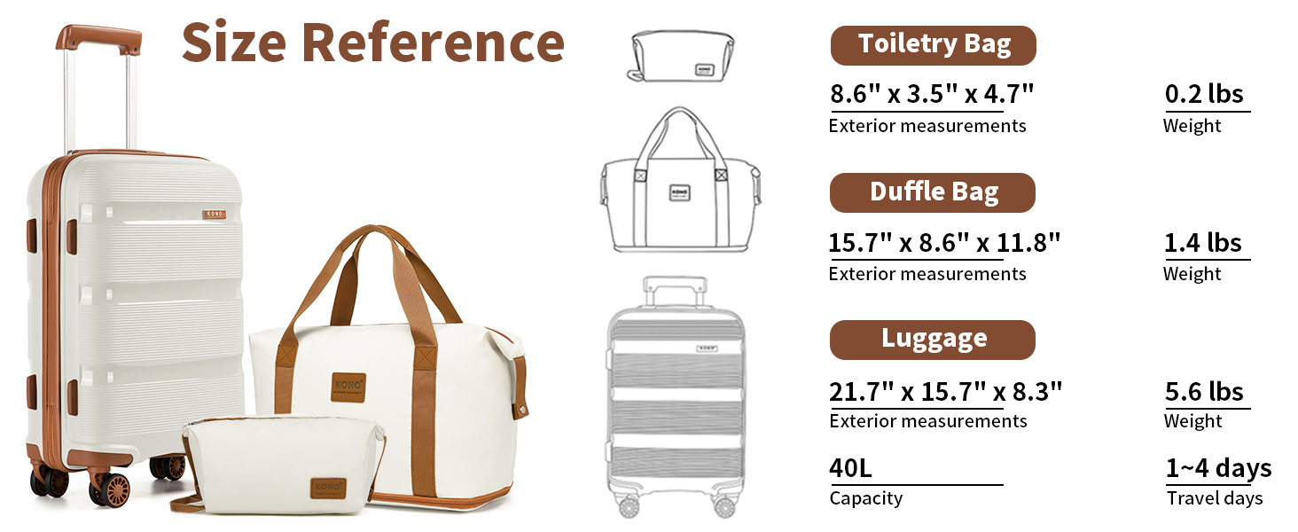 【3 Piece Luggage Sets have 2 Year Warranty】Carry-Ons Suitcase: 21.7" x 15.7" x 8.3"; Weekender Bag: 15.7" x 11.8" x 8.7"; Toiletry Bag: 8.6" x 4.7" x 3.5". Perfect for leisure and fashionable travelers, weekend getaways travelers, short business traveler. We offer a 2-year guarantee replacement service covering all manufacturing defects.
