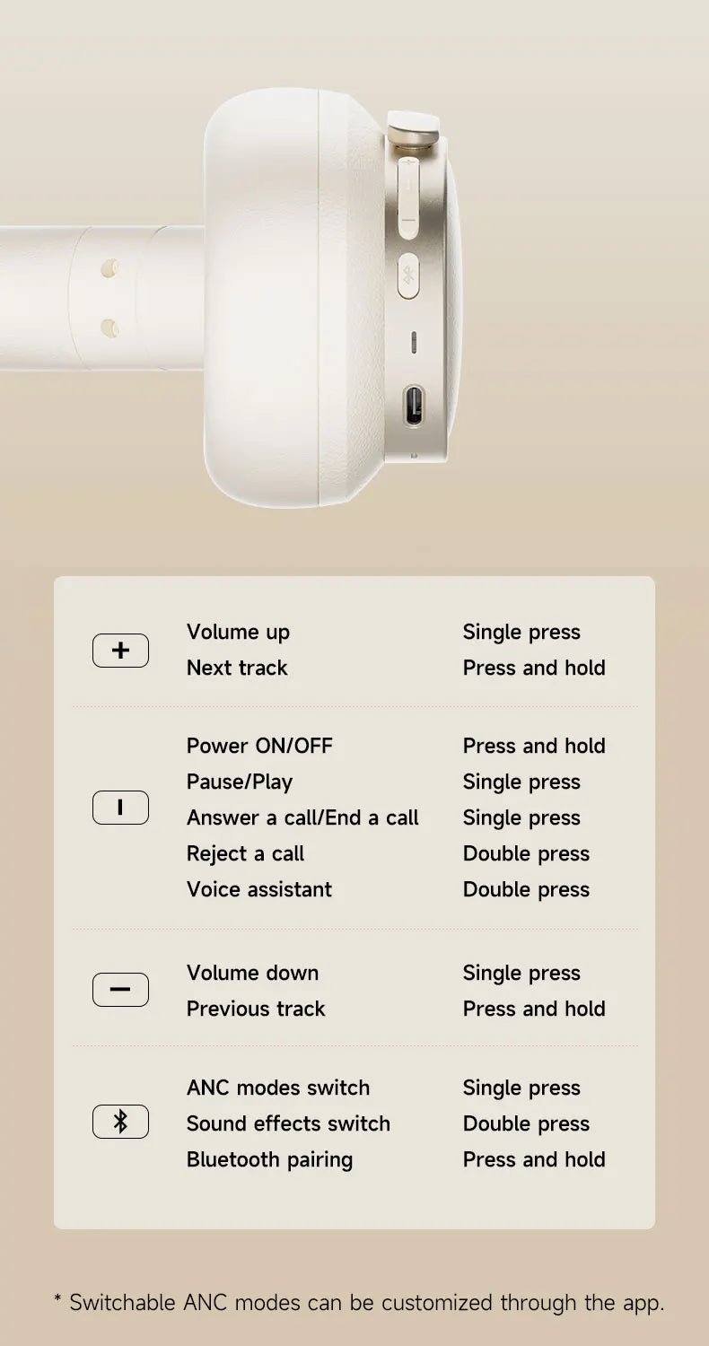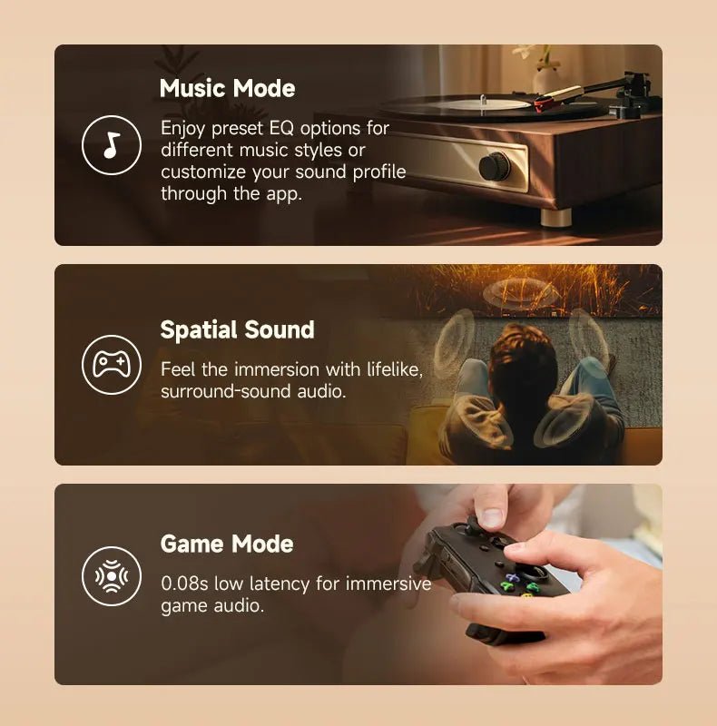 ·Music Mode - Enjoy preset EQ options for different music styles or customize your sound profile through the app.
