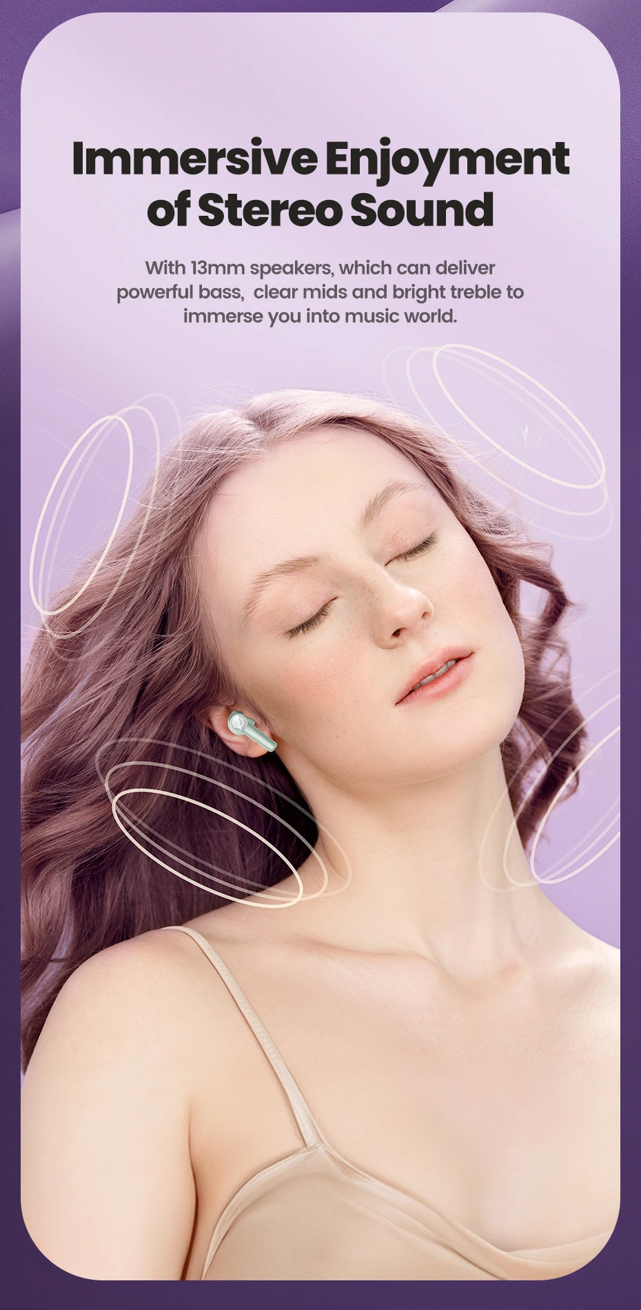 ✅ HiFi Stereo Sound – 13mm large dynamic drivers deliver deep bass, crisp mids, and detailed treble.