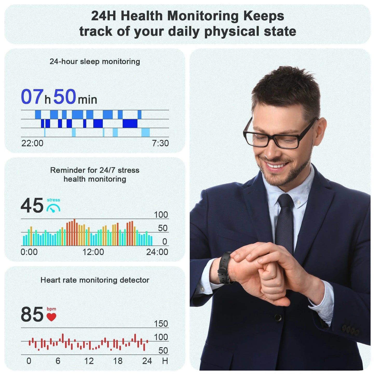 Function: Incoming call reminder, dialing, call log, message reminder, pedometer, calorie consumption calculator, exercise mileage log, rest-screen clock, weather, camera control, blood oxygen, customized dials, music control, stopwatch, alarm clock, timer, countdown timer, stress relievers, sleep aid, sedentary reminder, breathing training, calculator, games, messages, goal achievement reminder, drinking water reminder, find phone, 24-hour heart rate monitor, night sleep quality monitor, voice Assistant, All-day stress monitor, Wrist flip, Women's health tips, etc