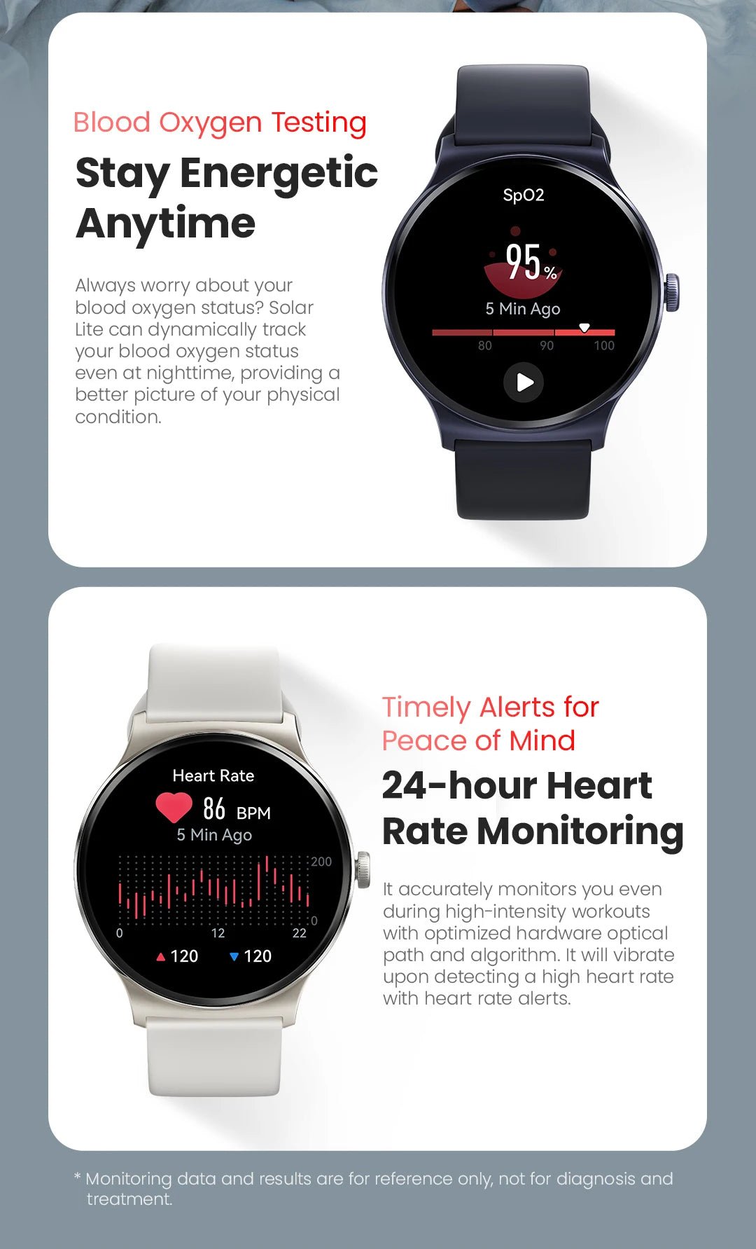 Always worry about your blood oxygen status? Solar Lite can dynamically track your blood oxygen status even at nighttime, providing a better picture of your physical condition.