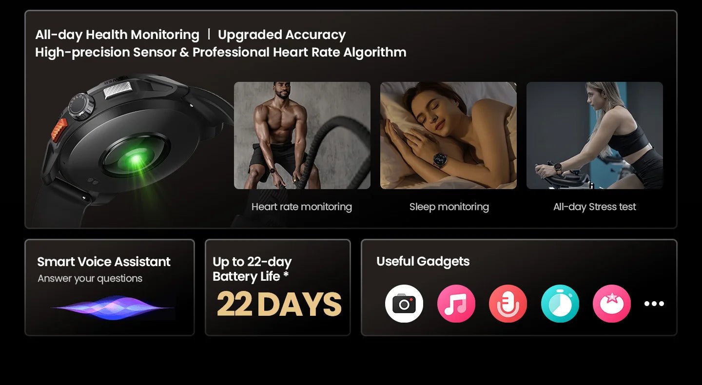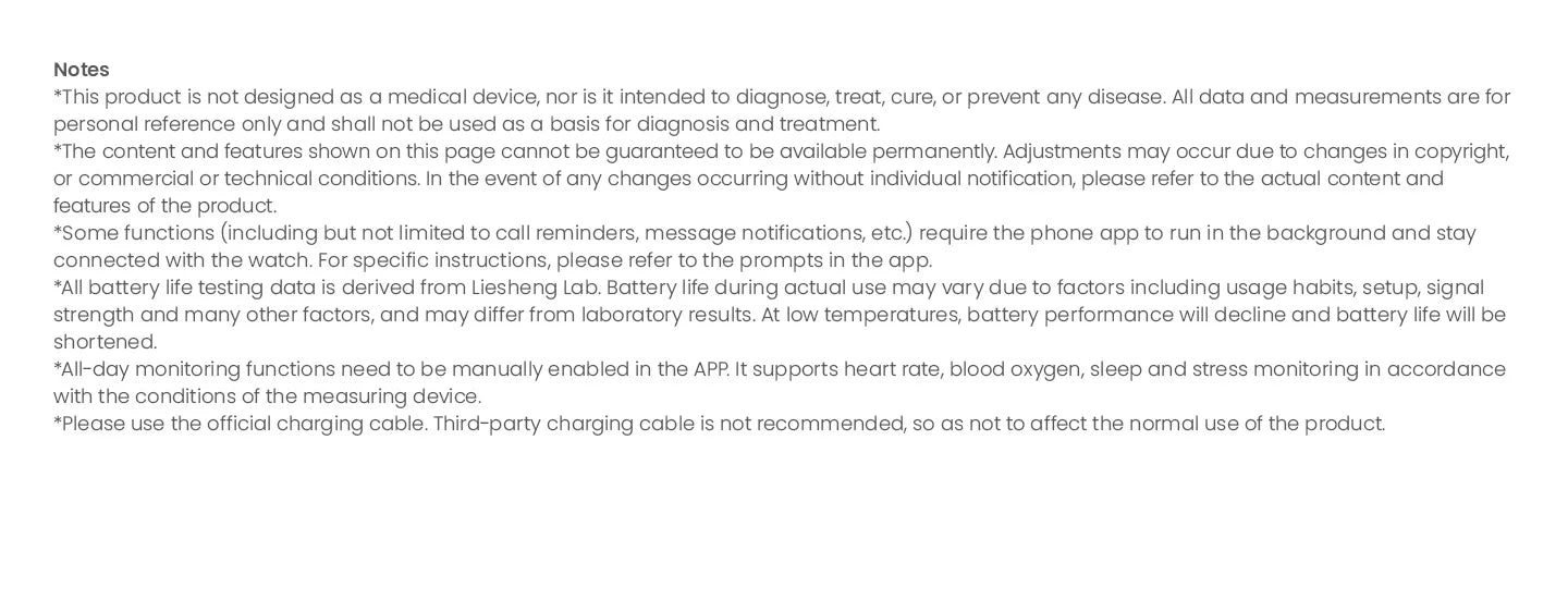 Sleep Monitoring / Heart Rate Monitoring / Blood oxygen detection / Female Menstrual Cycle / Stress Test / Sedentary Reminder / Water-intake Reminder / Medication Reminder / Hoart Rate Alort / Emotion detection / Breathing Training / Motion Detection.