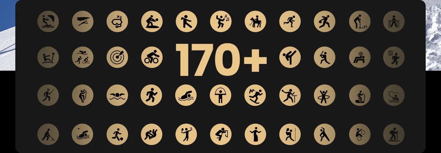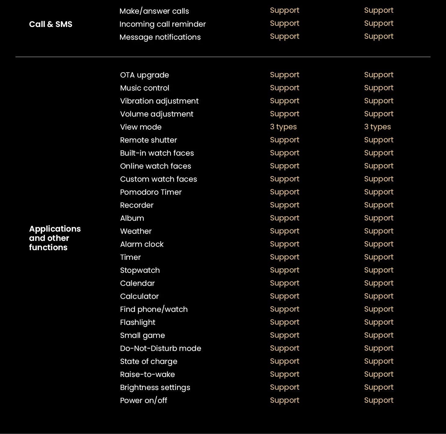 GPS Positioning / Support Compass / Support Barometer / Support Altitude / Bluetooth Calls / Make/Answer Calls / Incoming Call Reminder / Smart Message Notification / One-tap Connection Prompt / Voice Assistant / Bluetooth 5.3 / SOS Emergency Call / 170+ workout modes / Calorie monitoring / Pedometer / Goal-achieved Reminder / Workout Recording / Album storage function / Local music / Recording function / Remote shutter / Sync with Strava