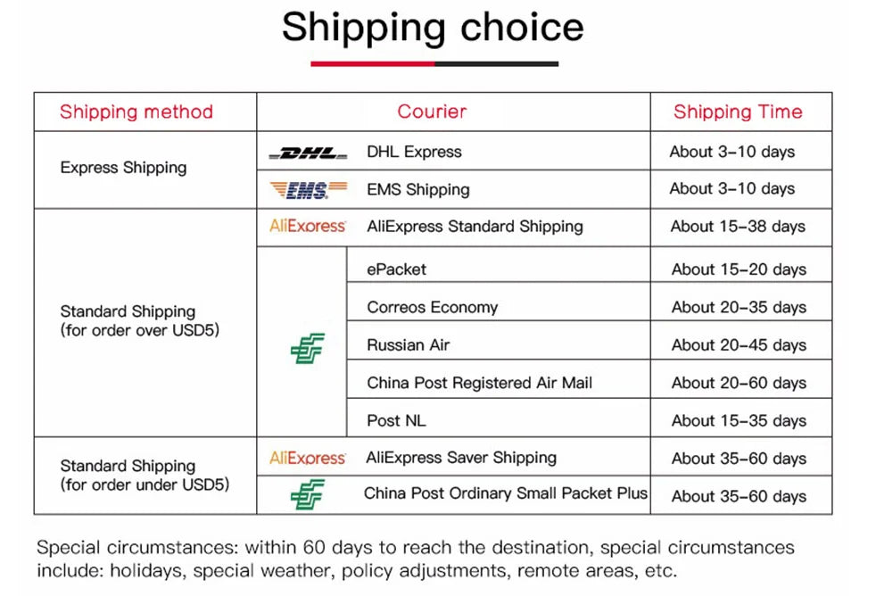 Please Note: Your delivery time may be affected due to customs and weather or shipping seasons such as Christmas. Please be patient and wait a little longer.