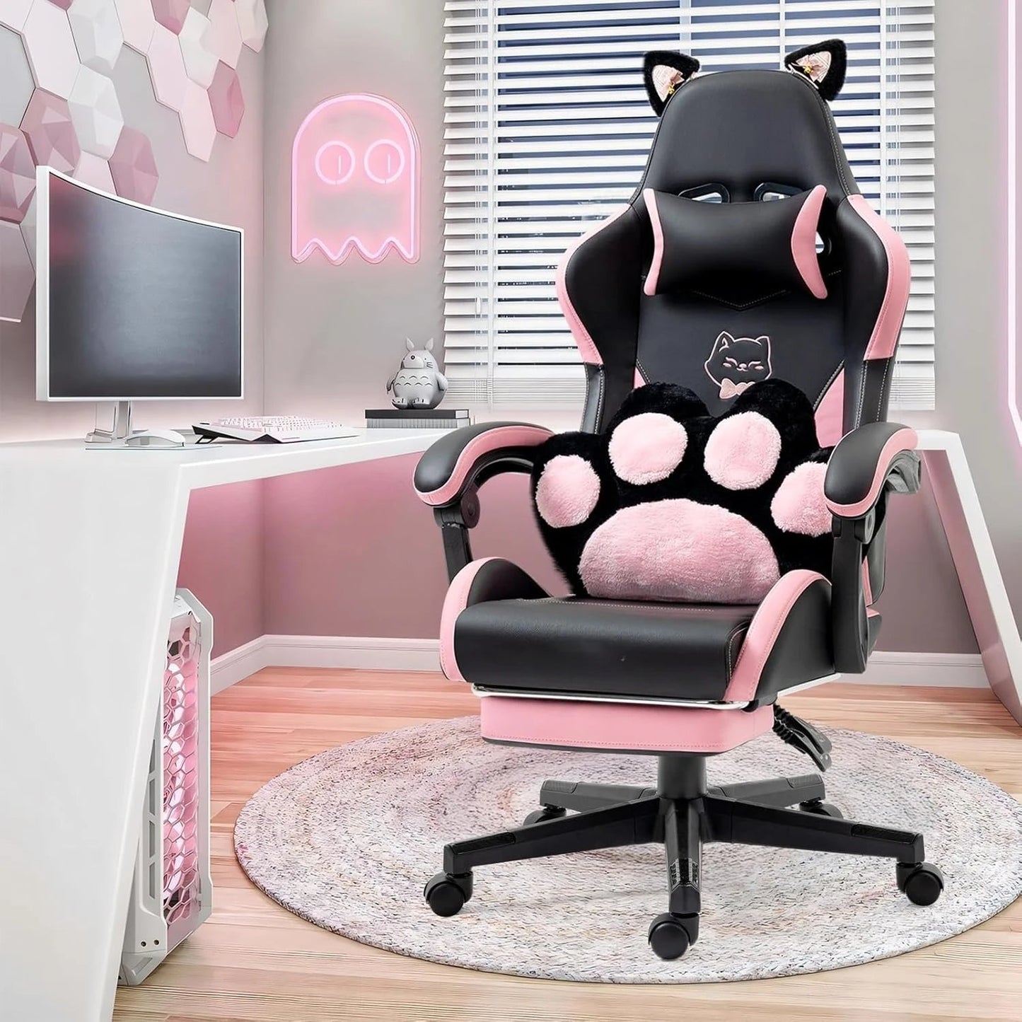 "Cute Gaming Chair with Lumbar Cushion & Decorative Ears – Ergonomic Reclining PC Game Chair with Footrest"