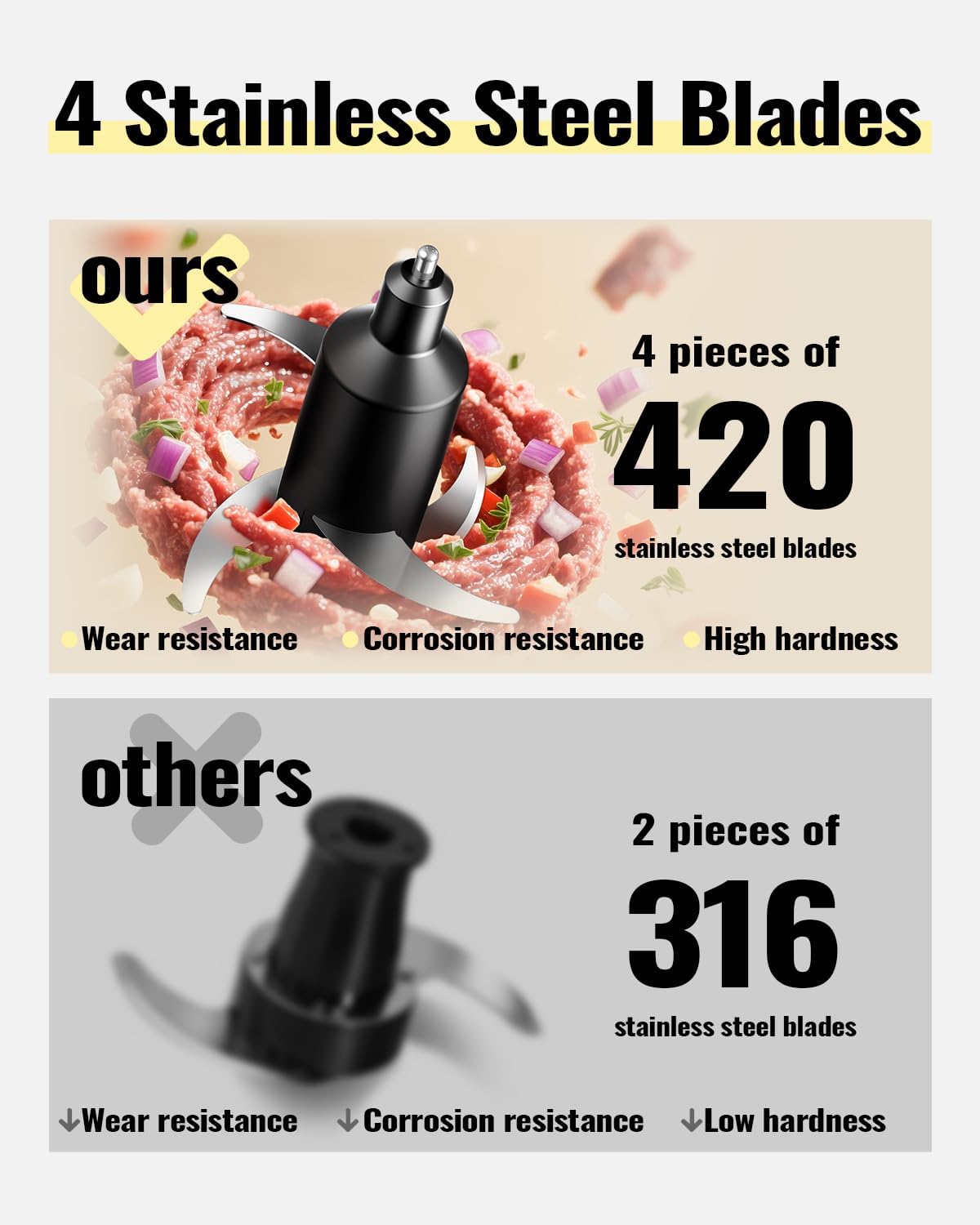 🔹 4 Bi-Level Stainless Steel Blades: Designed to outperform traditional two-layer blades, the bi-level configuration ensures faster, even chopping and consistent results every time.